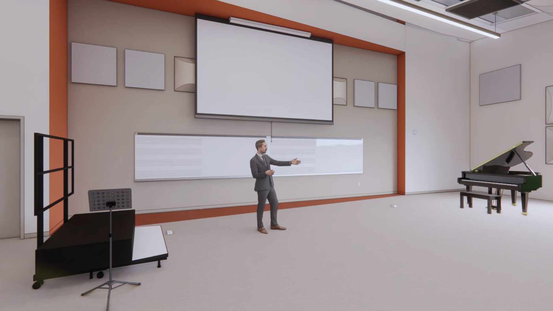 The music addition and renovation will include a large rehearsal room, studio offices for teaching, a piano lab, a band room, a music education room, and two additional classrooms.