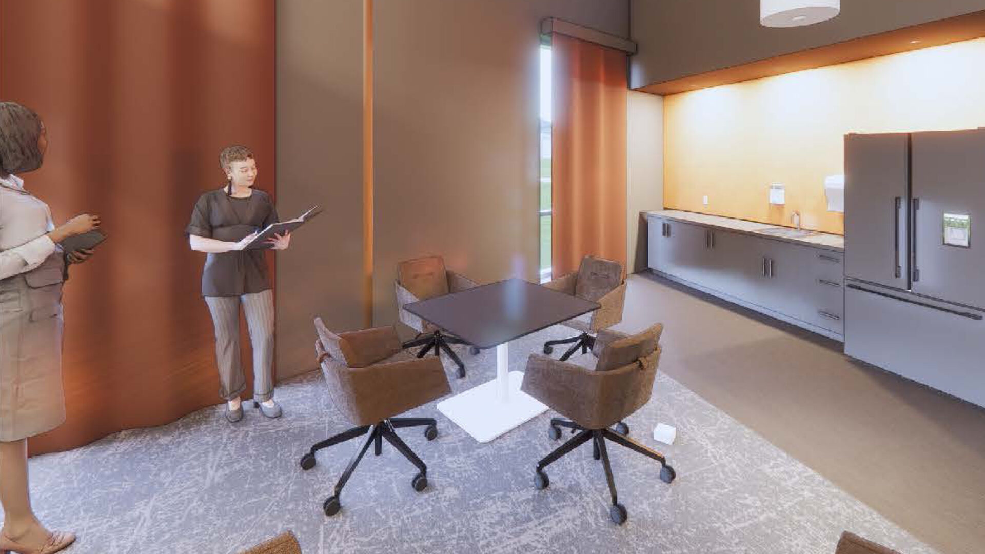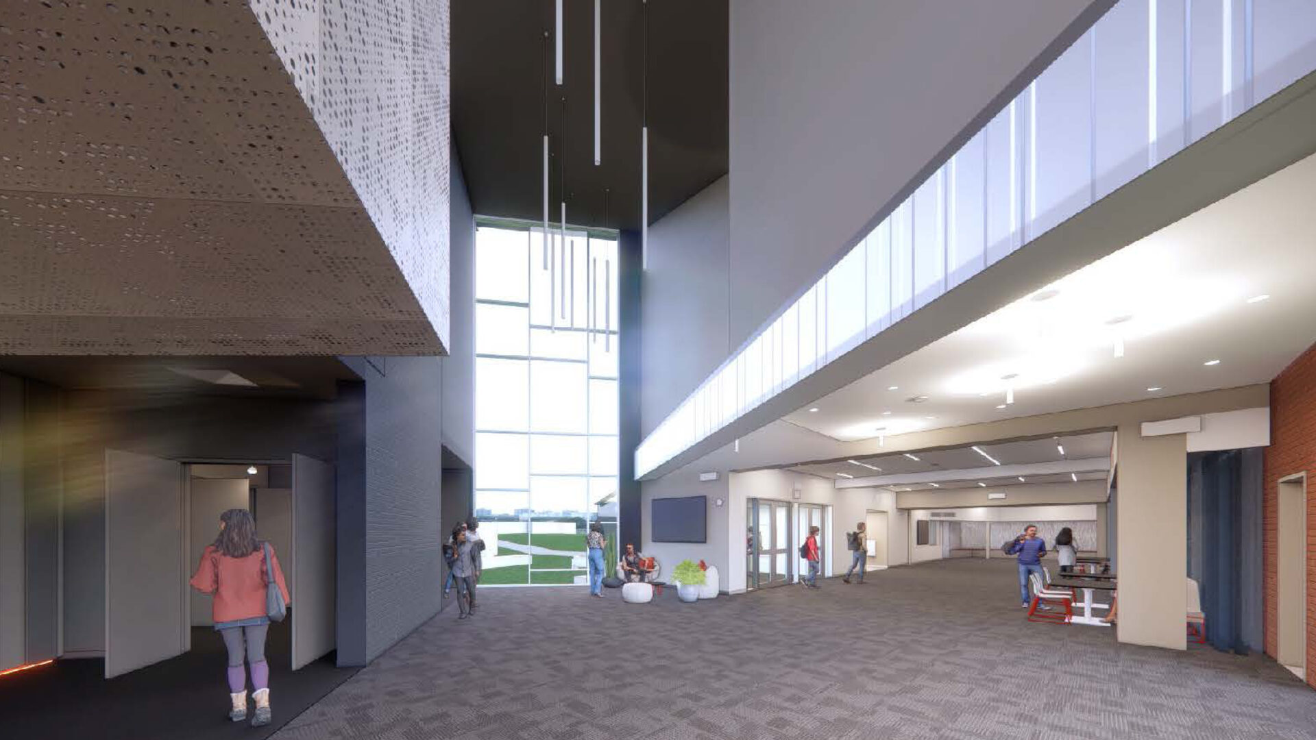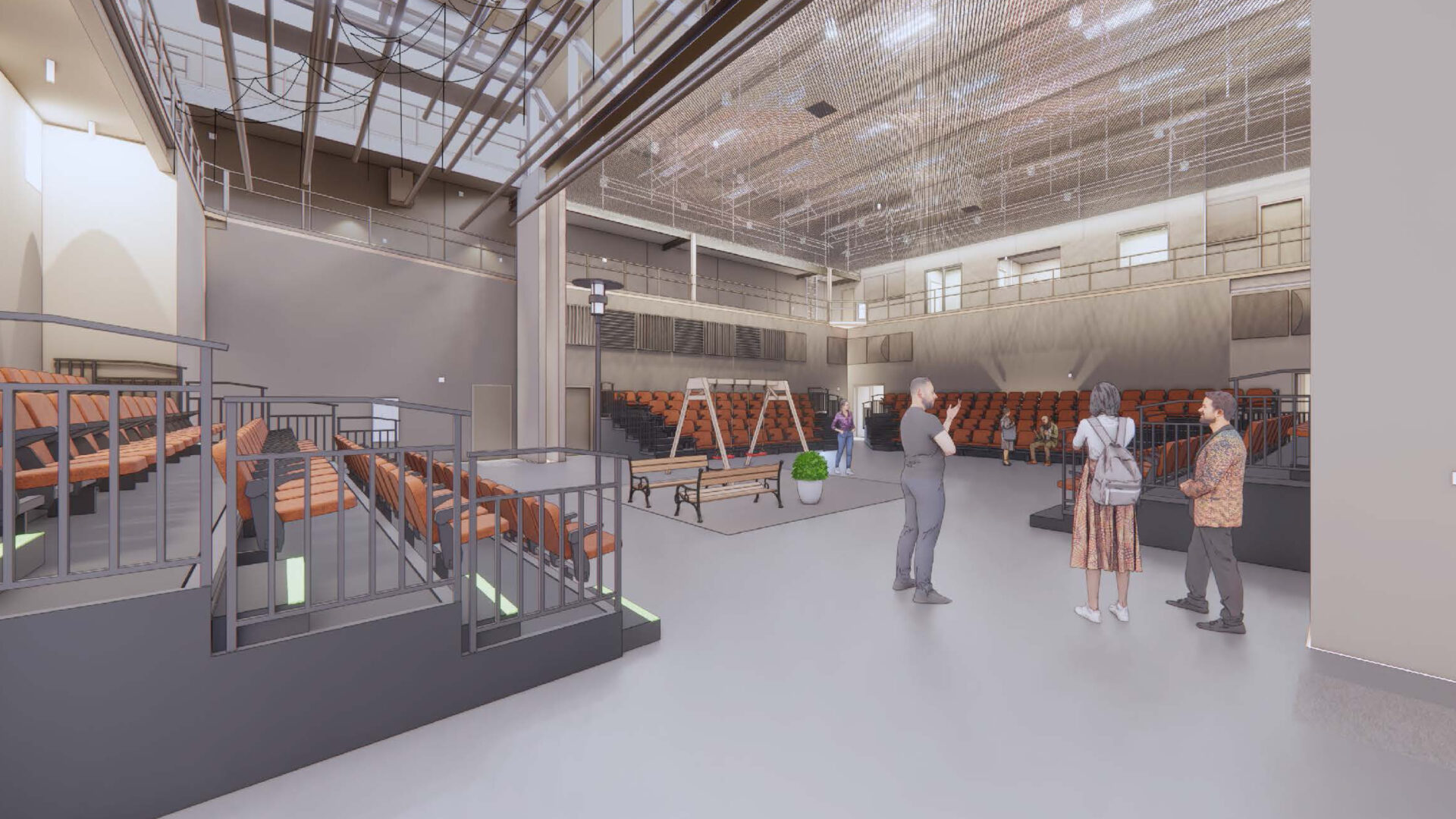 The theatre portion of the PAC includes a high-tech, black box theatre that can seat 223 people. All audience members will be greeted with a modern, comfortable viewing experience, and a carefully crafted sound experience will ensure the words from the stage reach all corners of the space. A walkable tension grid, various catwalks, and motorized line sets will create limitless possibilities more efficiently and safely.