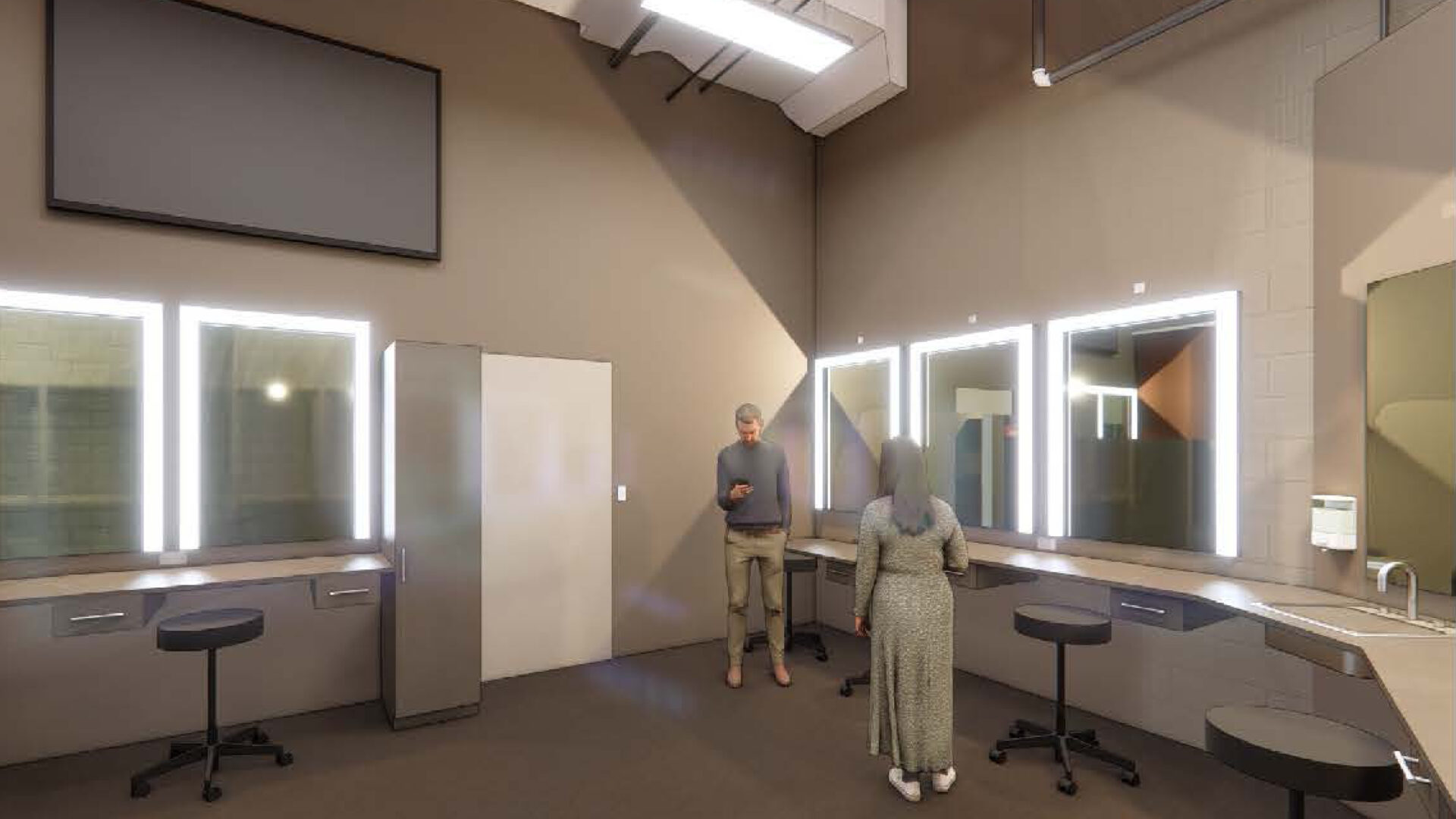 A green room will serve the performers and backstage crew during productions and act as a meeting space at other times. Dressing rooms will serve each production by night and function as a laboratory or classroom space by day. Additionally, a scenery construction shop will allow scenery to flow almost effortlessly from the shop to the stage.